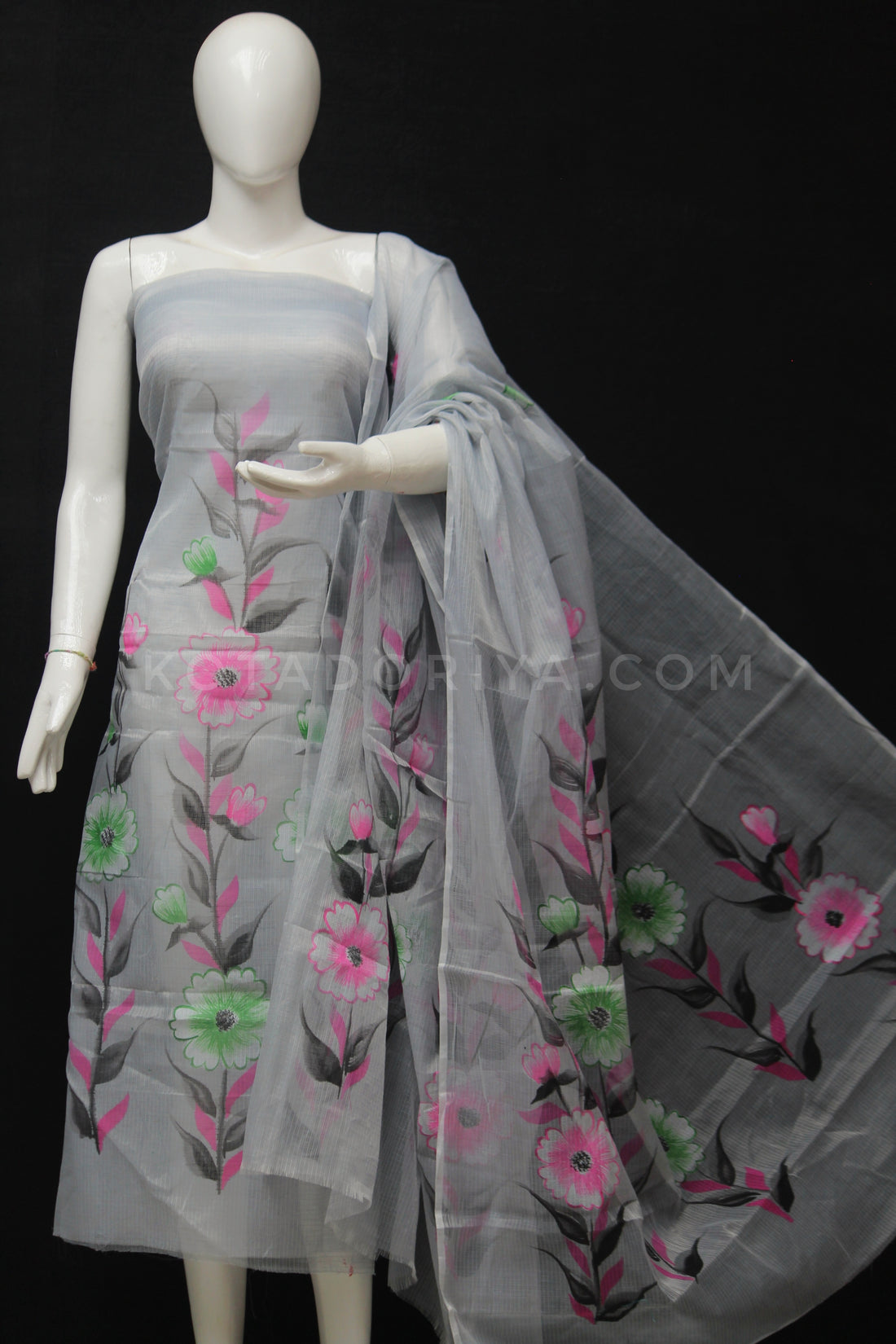 Gray Kota Doria Cotton Hand Pented Dress Material With Bottom.