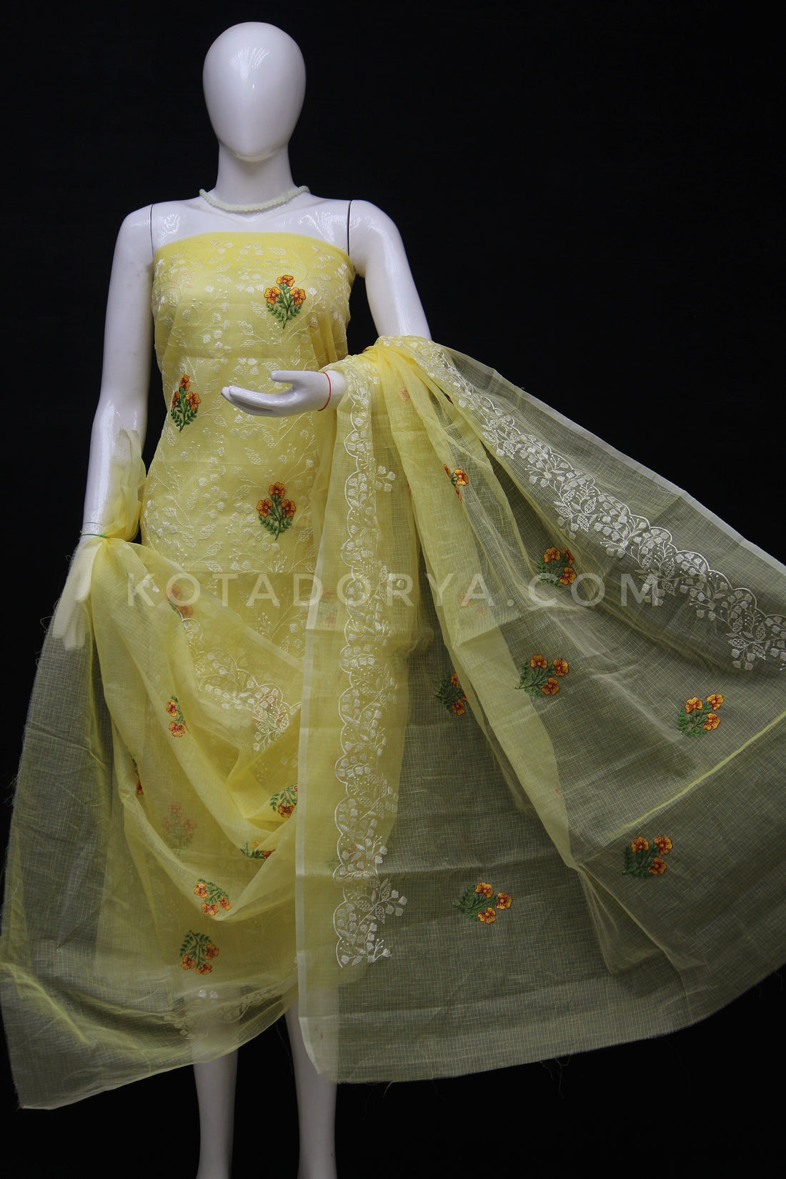 Yellow Kota Doria Cotton Embroidery Work Dress Material With Bottom