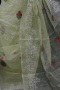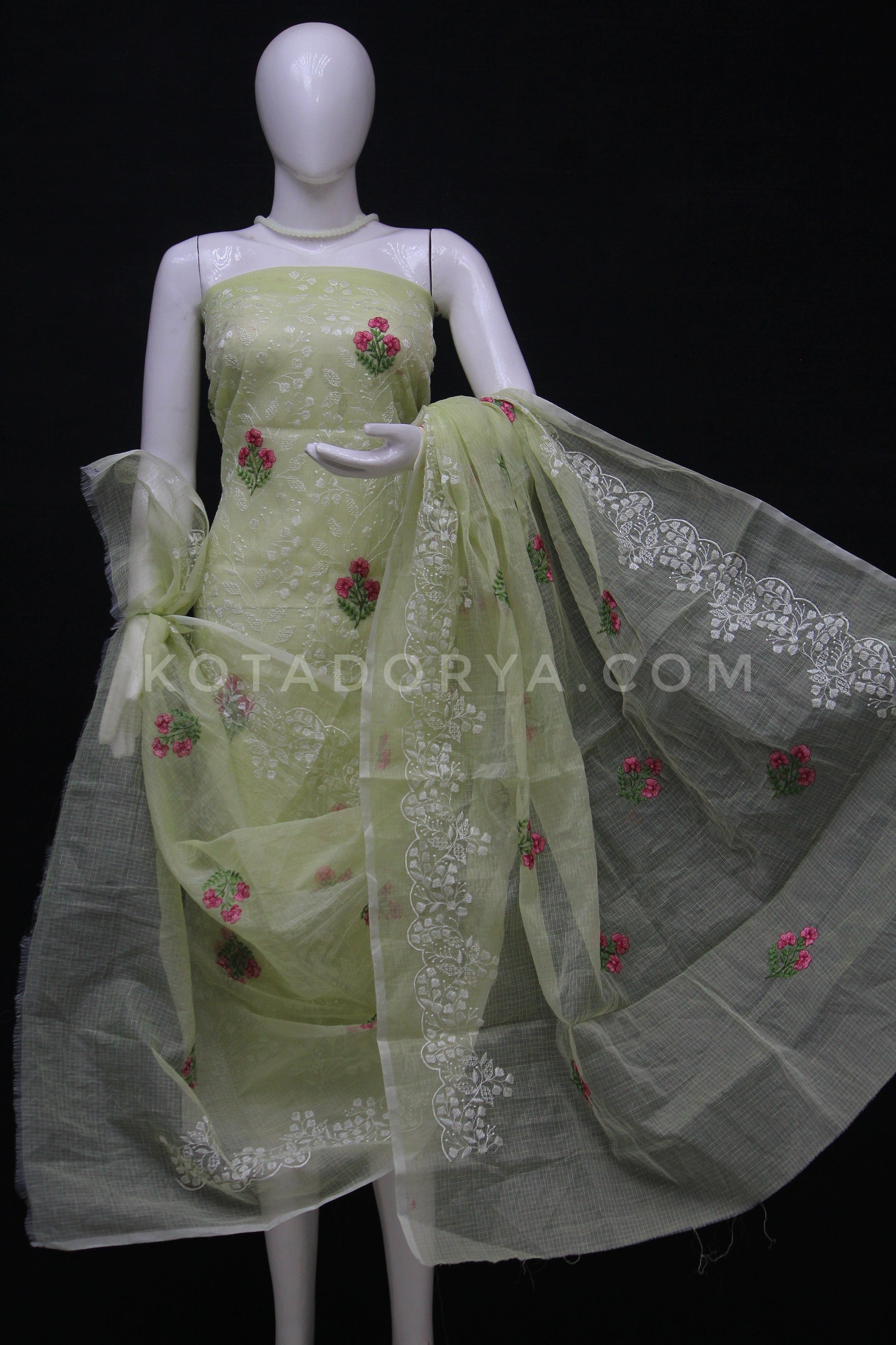 Pista Green Kota Doria Cotton Embroidery Work Dress Material With Bottom